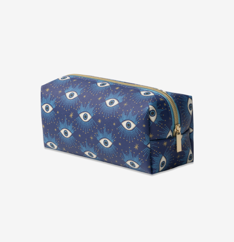 Mindre necessär med mönster av ögon. Perfekt förvaring för smink, hudvård, kontorsmaterial eller små resetillbehör. Gjord i veganskt läder, vilket gör den slitstark och lätt att torka av.
