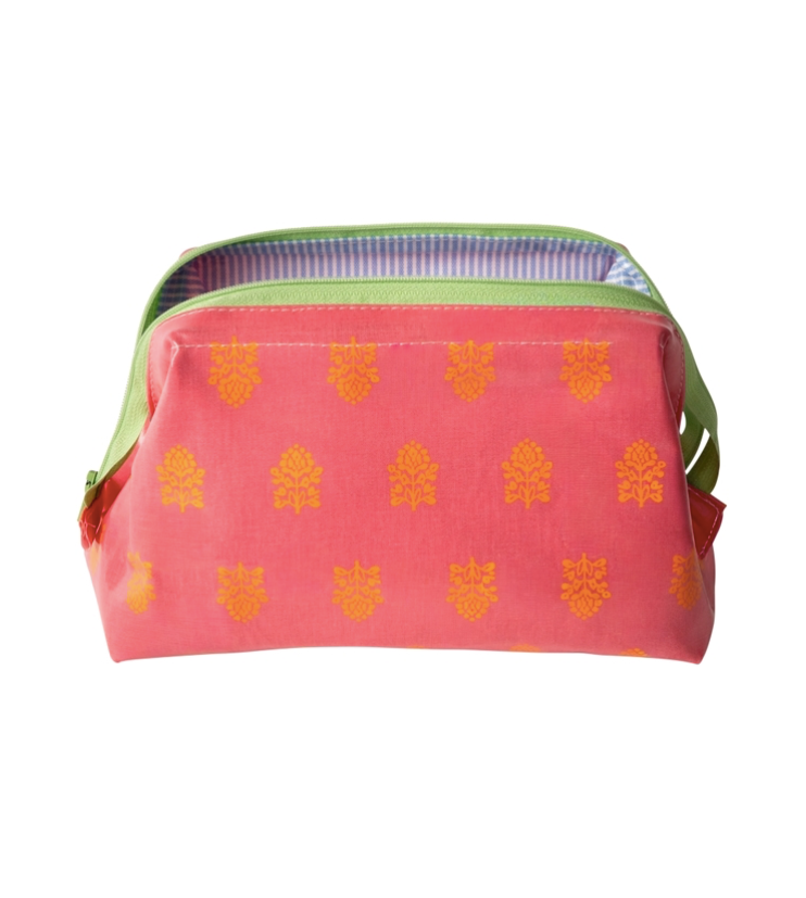 Medelstor necessär med ett vaxat och mönstrat tyg. Den har en vaxad insida, vilket gör den lätt och smidig att torka ur.