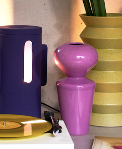 Djärv vas i keramik med en violettlila högblank glasyr. Vasen är vacker både med och utan blommor.