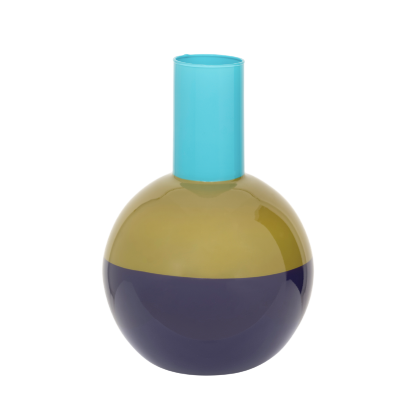 En större vas i djärva färgblock av blått, olivgrönt och lila. Med sin rundade mage och smala hals känns Lahja både lekfull och skulptural. En modern mittpunkt för en enstaka blomma eller bara som den är.
