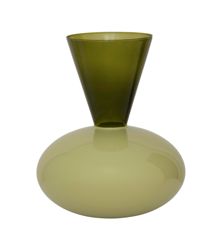 En färgblocksdesignad vas tillverkad av återvunnet glas, med en lökformad, ogenomskinlig boknötsfärgad bas och en utsvängd, transparent dagsländefärgad topp. Dess djärva kurvor och feminina silhuett ger den en distinkt närvaro, medan den harmoniska blandningen av gröna toner tillför värme och elegans. Ett slående uttalande för alla inrednings- eller blomsterarrangemang.